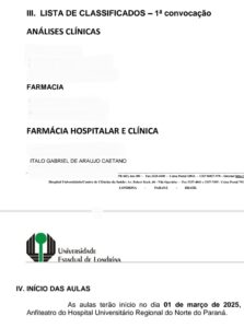 O UNIFIO comemora mais uma conquista de seus alunos! Ítalo Gabriel de Araújo Caetano, egresso do Curso de Farmácia, alcançou uma importante aprovação no Programa de Residência Multiprofissional em Farmácia Hospitalar e Clínica da Universidade Estadual de Londrina (UEL), ficando em 3º lugar no concorrido processo seletivo.