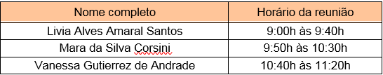 I – Convocar os candidatos classificados para se apresentarem no dia 09 de dezembro virtualmente, na sala de reuniões da plataforma google meet através do linke que será enviado ao email do candidato nos horários apresentados abaixo:
